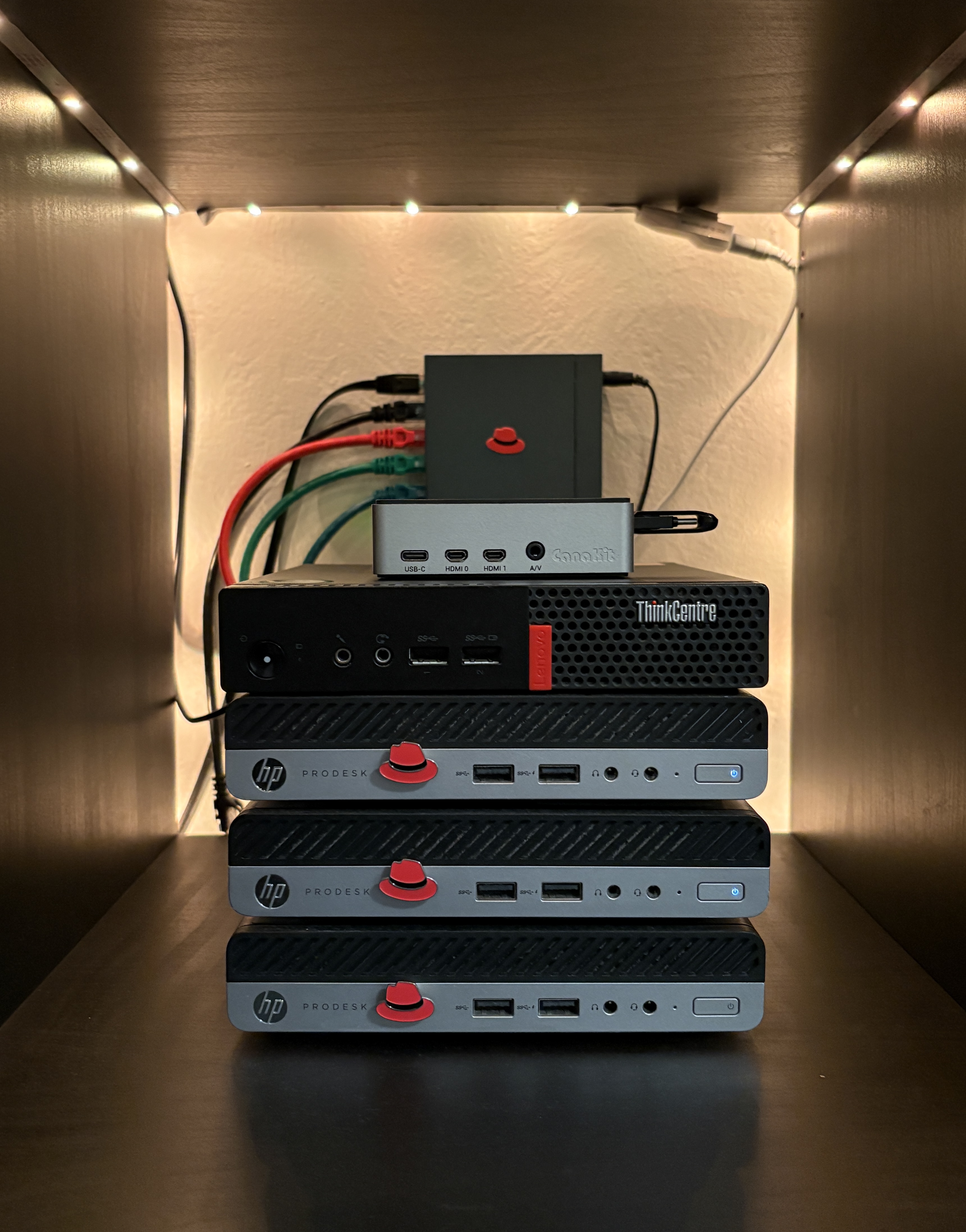 TL;DR: Upgraded from a single Raspberry Pi to a multi-node homelab featuring 3x HP ProDesk Mini PCs and a Lenovo ThinkCentre, running Proxmox for virtualization with Tailscale VPN for remote access. One node serves as a Windows 11 Pro workstation, while the other two form a Proxmox cluster for running self-hosted services and NAS.