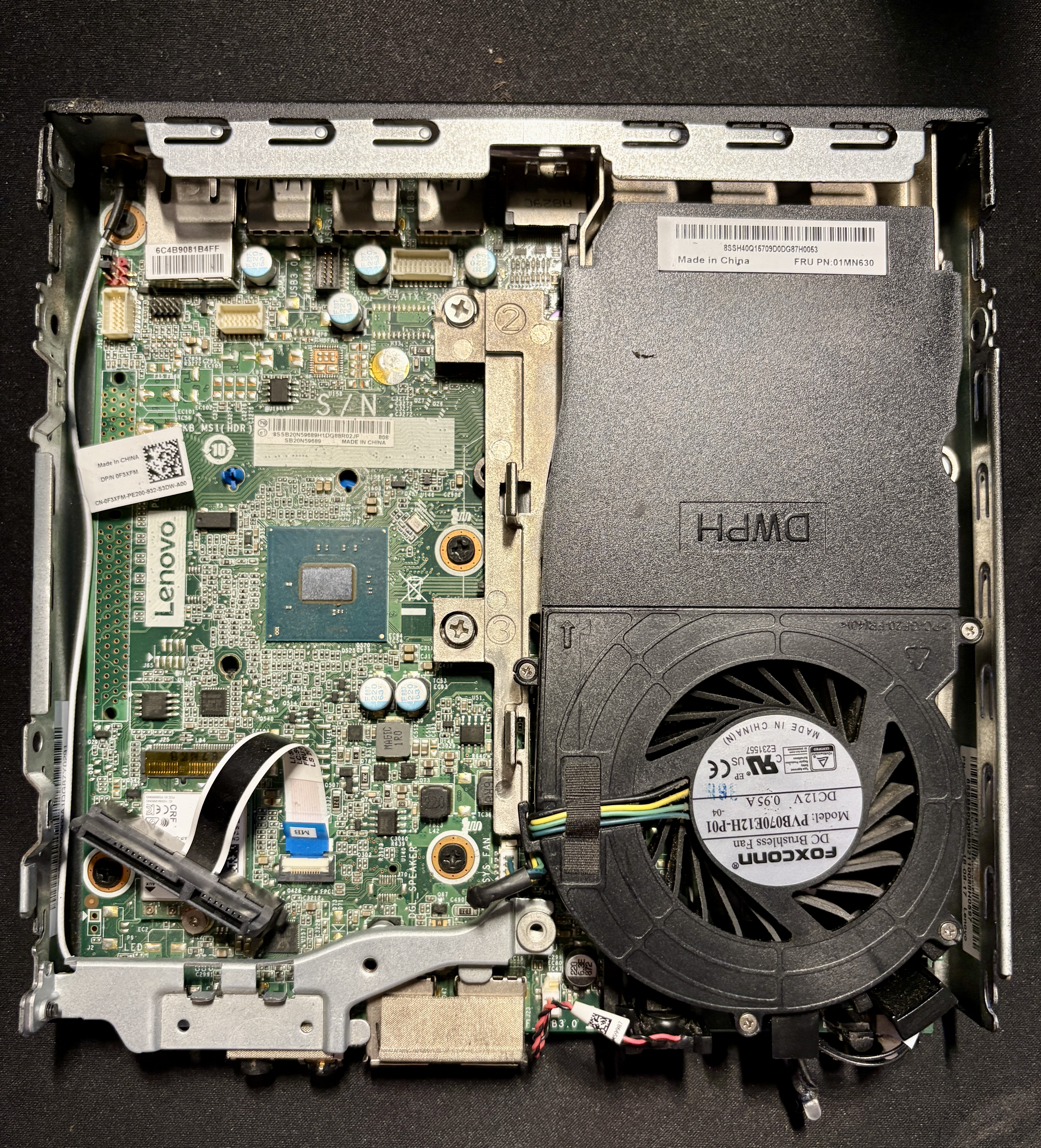 This is what a 1-liter mini PC looks like from the inside. It has two RAM slots, one 2.5-inch SATA bay, and one NVMe drive slot.