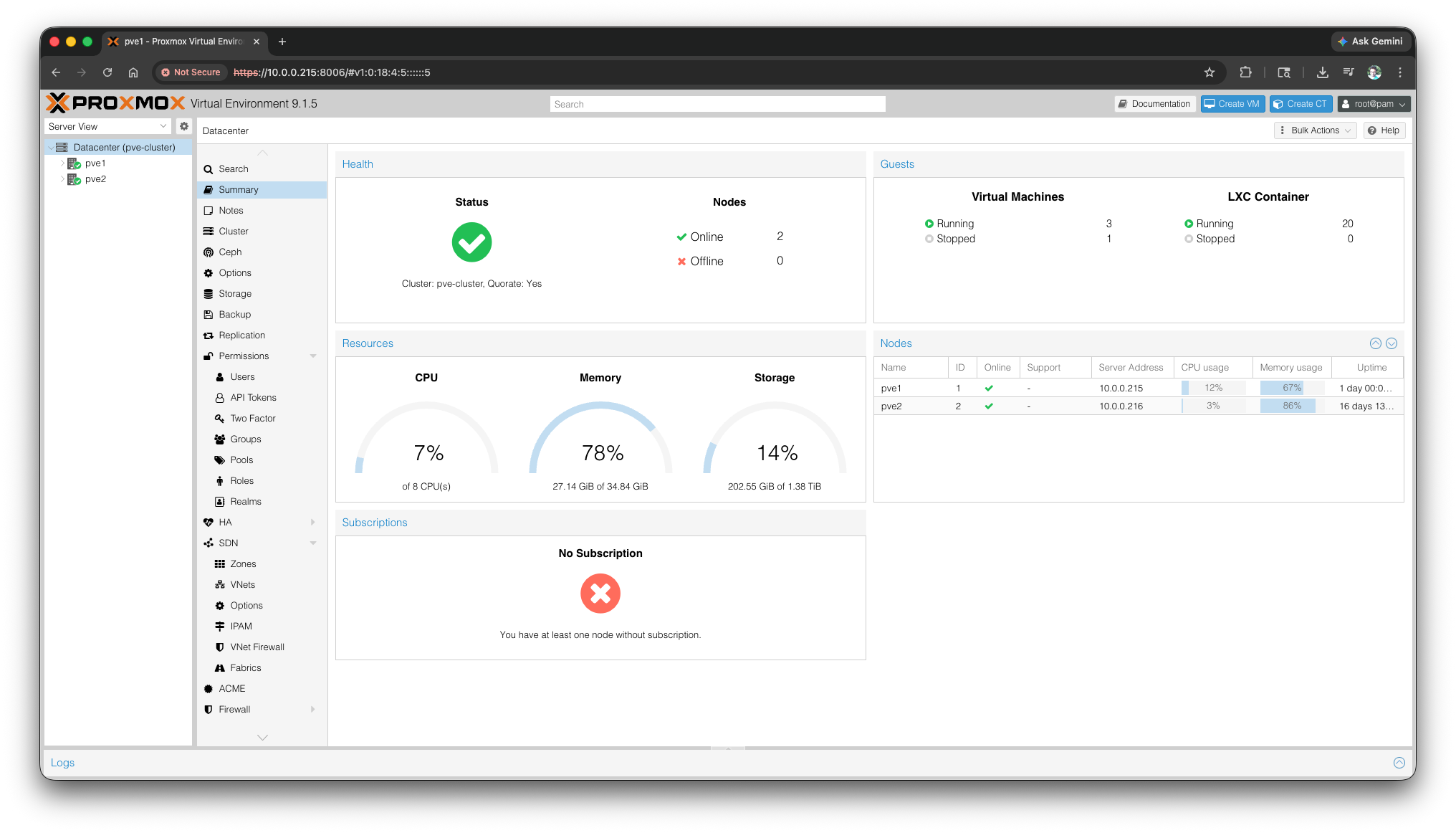 This dashboard shows both nodes in the cluster and gives a quick overview of resource usage and status.